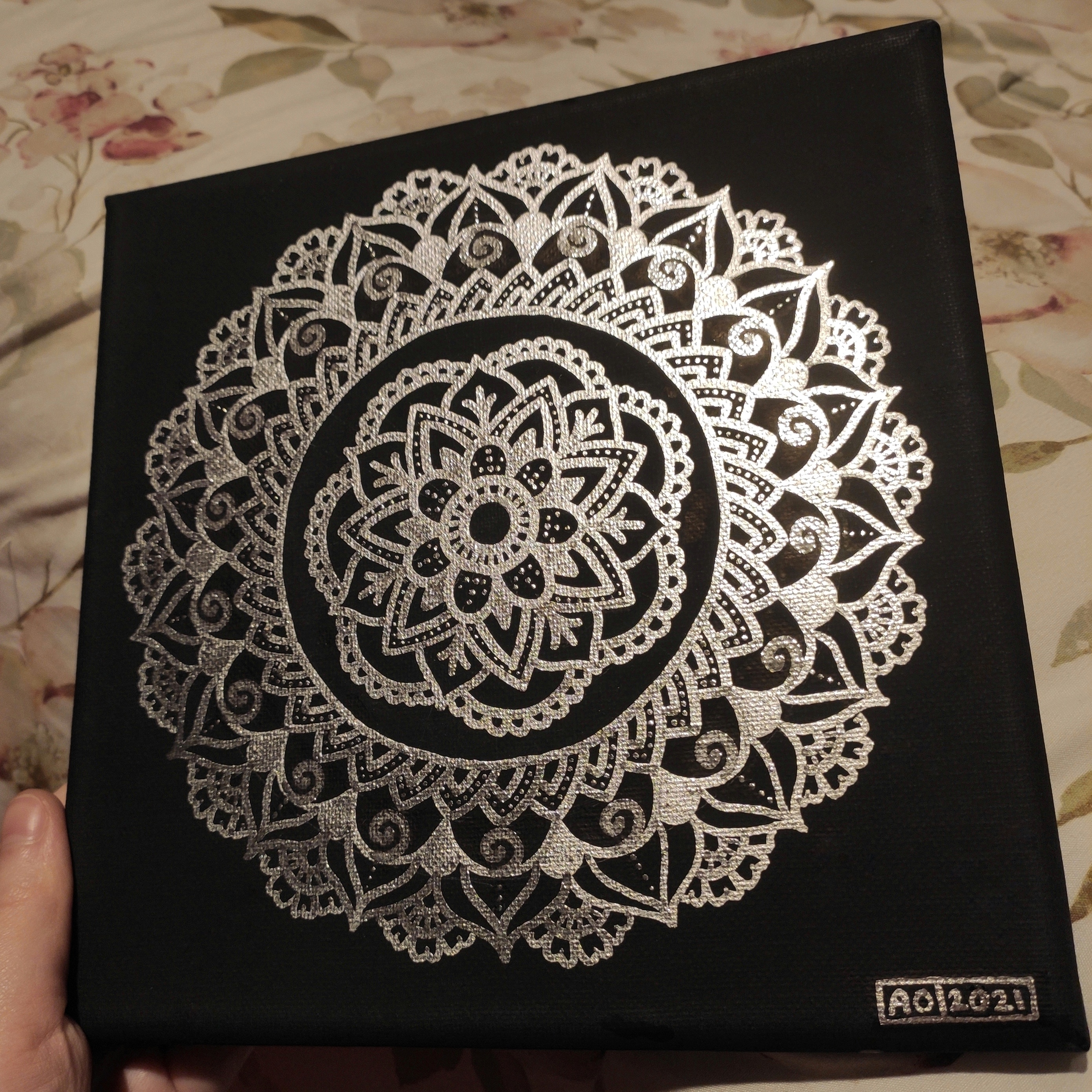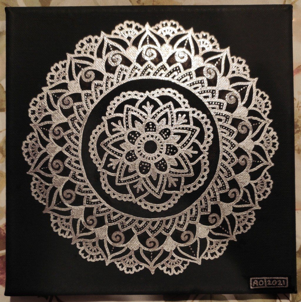 Despite the simple design, this mandala took me about two weeks to complete due to perfectionism and procrastination. Most of the work was just trying to decide what pattern to do next!