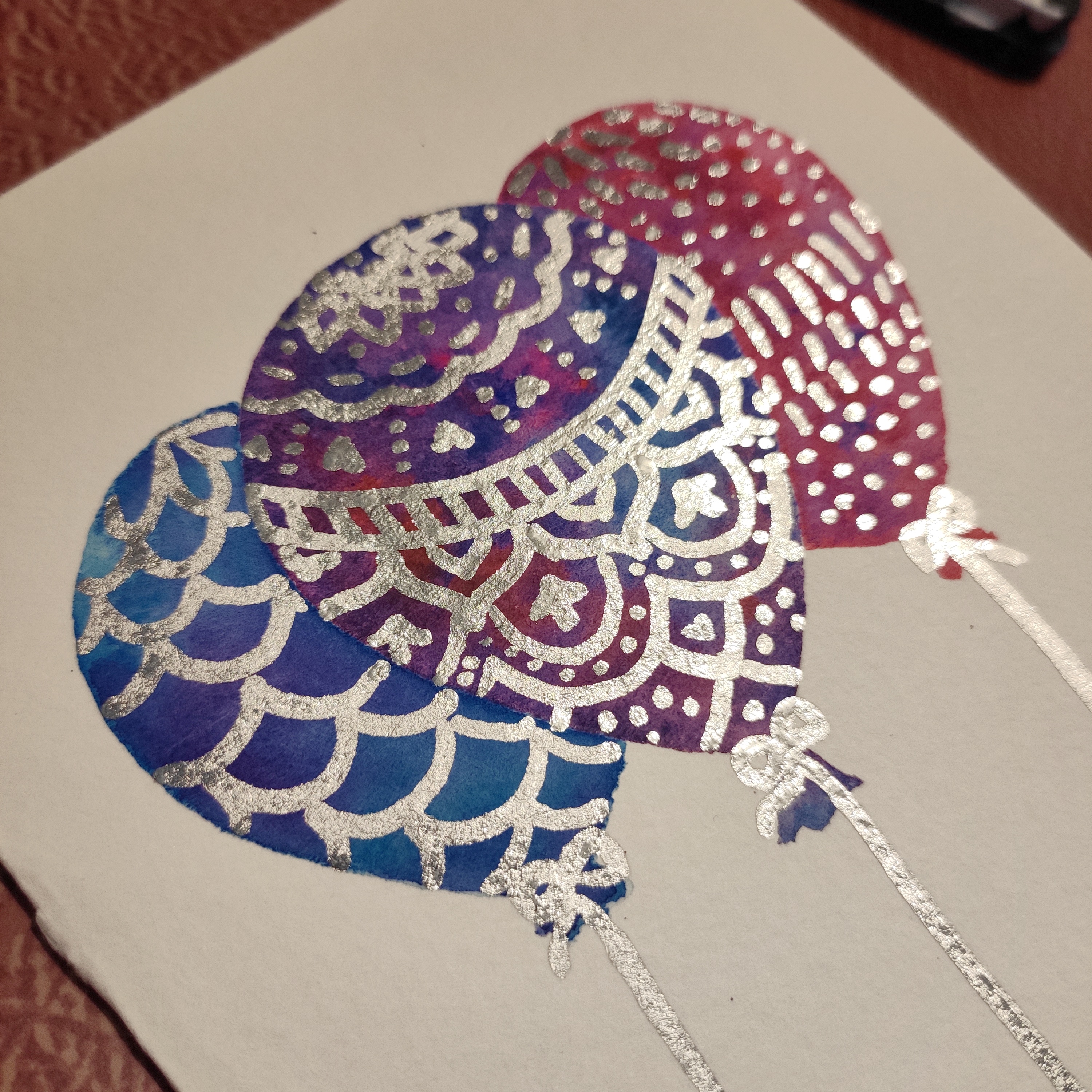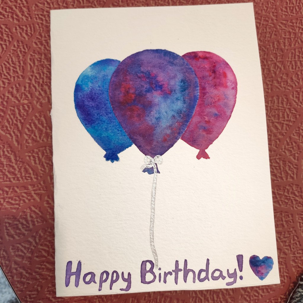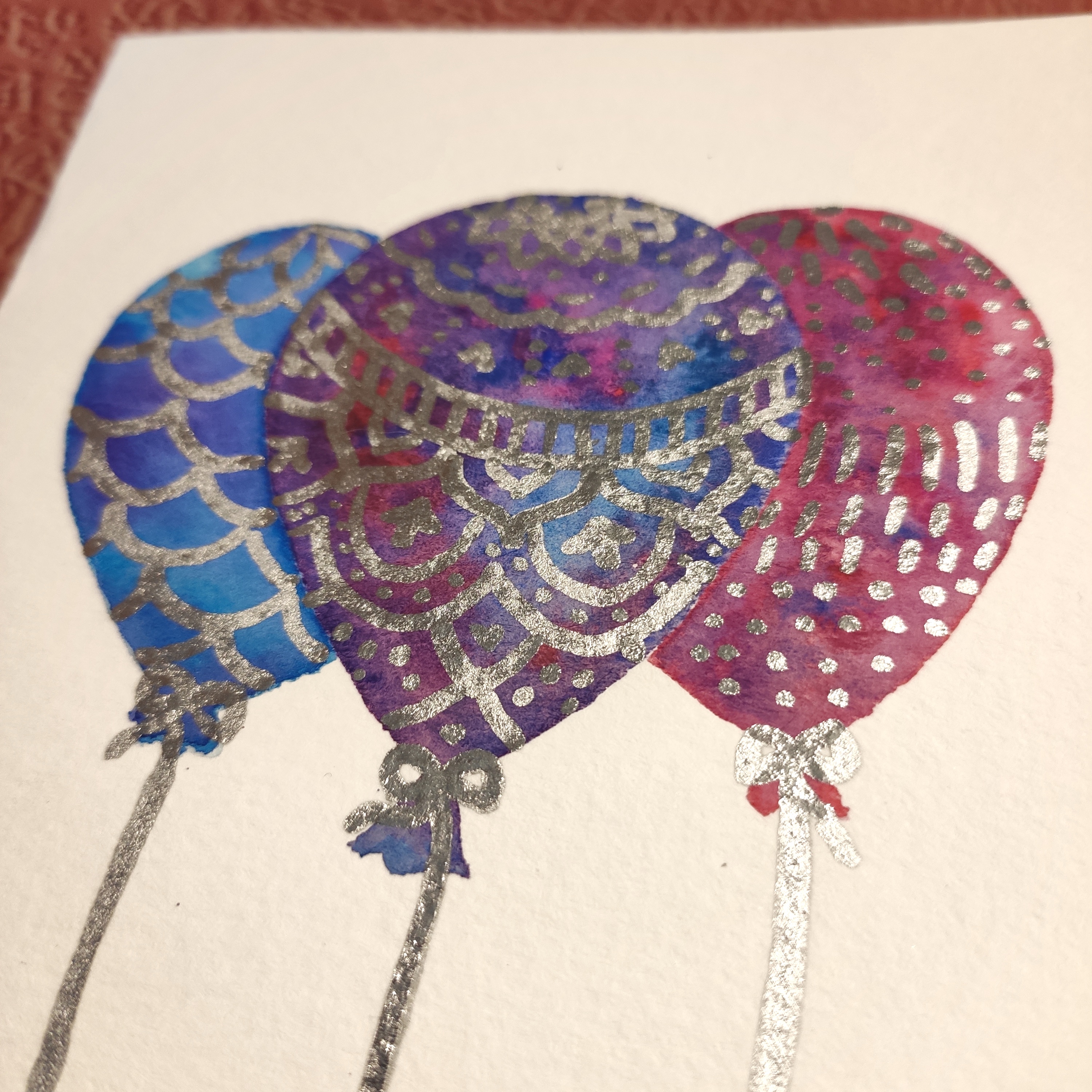 Once all of the water had dried, I added the chrome details. I knew I could have left the balloons with just the tie dye effect, but I enjoyed doodling on them. I’m really happy about how it turned out, it’s very much a birthday card! Simple but effective.