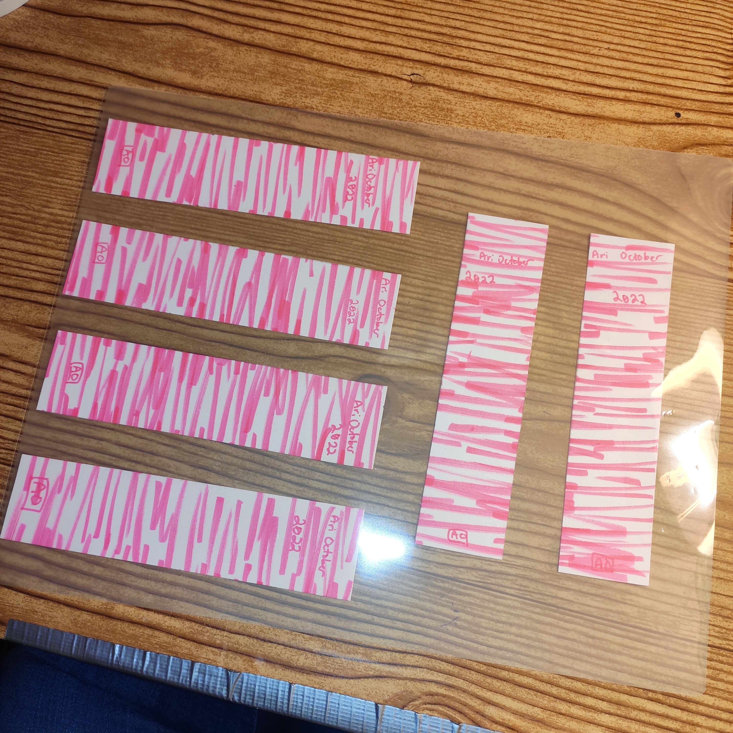 Next up was slicing up my work! A bit nerve wracking but I knew the results would be worth it. I signed each bookmark separately on the back before arranging them in the plastic lamination sheet.